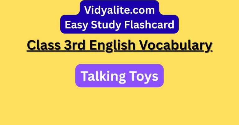 Study Chapter 5 Talking Toys dictionary flash card Chapter 5 of NCERT Class 3 English, Talking Toys, introduces young learners to fun and interactive vocabulary. This chapter is designed to enhance students’ understanding of common English words used in daily life through simple stories and toy-themed characters. Learning these new words helps build a strong … Continue reading NCERT Class 3rd English Vocabulary: Chapter 5 Talking Toys dictionary flash card