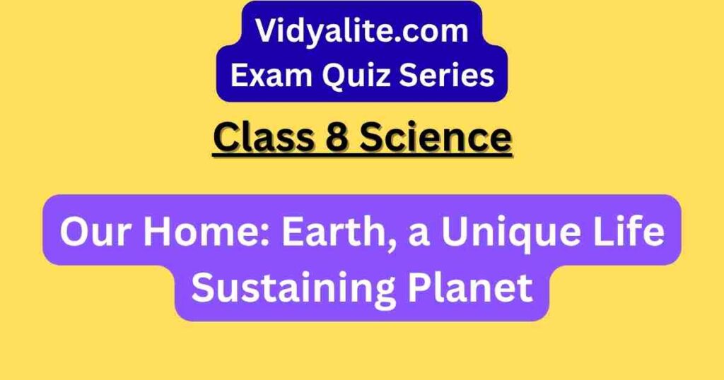 Boost your CBSE exam preparation with our Class 8 Science Chapter 13 – Our Home: Earth, a Unique Life Sustaining Planet MCQ Test. This free online quiz is crafted from NCERT textbooks, CBSE syllabus, educational videos, and Vidyalite’s Flashcards to help you master concepts about Earth’s structure, atmosphere, hydrosphere, biosphere, and its role in sustaining life. Ideal for students who want quick revision and strong conceptual understanding before exams.
