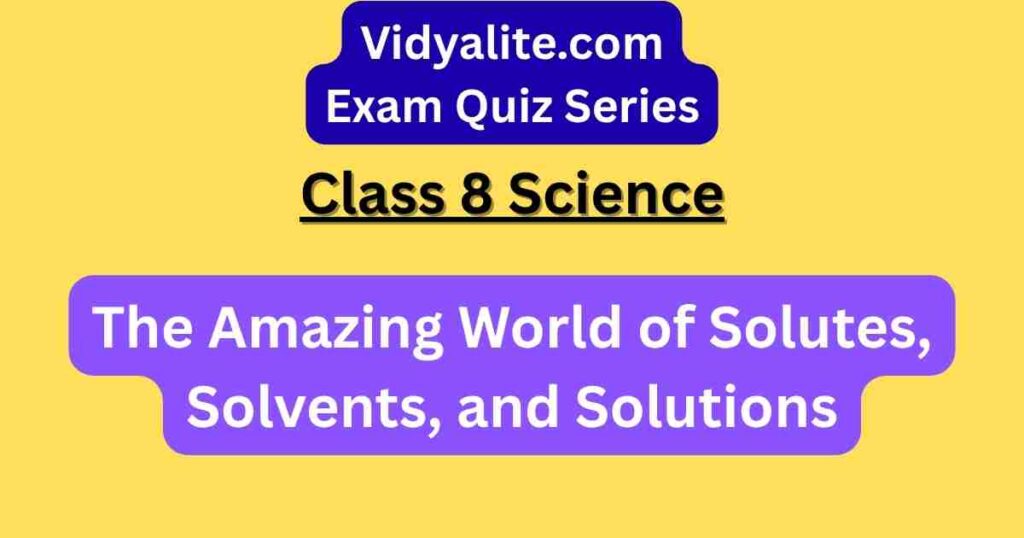 Boost your CBSE exam preparation with our Class 8 Science Chapter 9 – The Amazing World of Solutes, Solvents, and Solutions MCQ Test. This free online quiz is designed from NCERT textbooks, strictly following the CBSE syllabus, and supported by educational videos and Vidyalite’s Flashcards. It covers essential concepts like types of solutions, solubility, concentration, factors affecting dissolution, and real-life examples. Perfect for strengthening your fundamentals, quick revision, and competitive exam preparation.